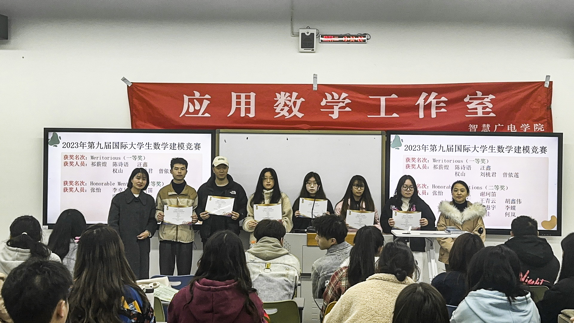 最后,由郭娜和卫金娟两位指导老师给在“2023年高教社杯全国大学生数学建模竞赛”国赛四川赛区四川省一等奖获奖队伍与“2023年第九届国际大学生数学建模竞赛”获奖队伍进行颁奖。