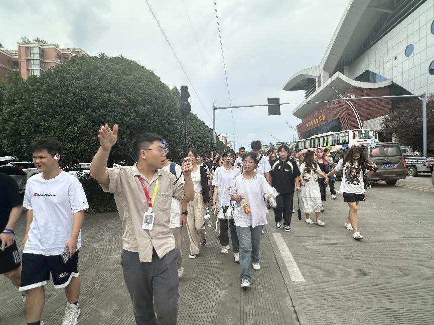“进入学校,首先映入眼帘的就是我们的艺体中心,开学典礼、毕业典礼等大型活动都在这里组织开展。“开学典礼结束后,杜天泽老师组织智慧广电学院2024级新生在艺体中心门口广场集合,正式开始游览介绍。