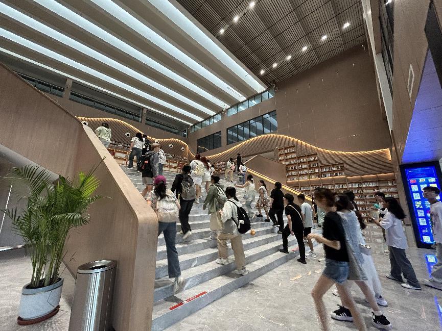 随后又参观了图书馆,杜天泽老师为在场的2024级新生解释了什么是“书山学海“鼓励大家多来图书馆,多看书,开卷有益。紧接着又到”元宇宙“馆参观,同学们见识了裸眼3D等时下最新前沿技术。