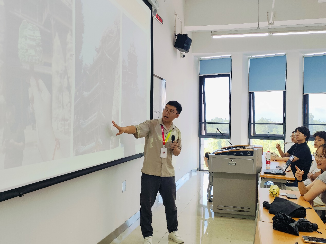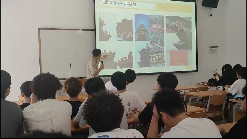 杜老师以最近大火的“黑神话悟空”为引,表示其中的很多取景地都在山西,顺势引出了自己的山西之旅。其结合PPT展示了自己在山西大同拍摄的城墙、古建等诸多具有深厚历史文化底蕴的风景。同时配合朗诵自己的游记,以解说词的形式向同学们展示了自己的旅游经过,引起了不少同学的共鸣,现场气氛良好。