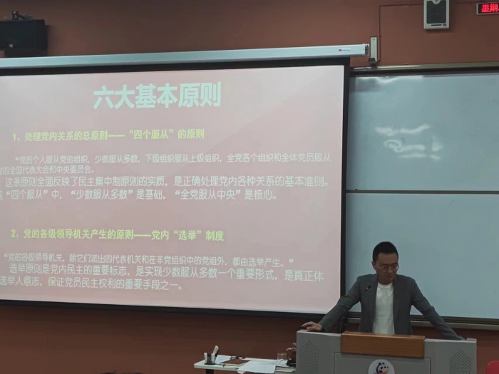 第一,这是一个讲规矩的党。中国共产党的规矩便是:根本组织制度与领导制度即民主集中制,民主与集中是一个辩证统一的关系,民主建设是基础,集中建设是关键,只有将民主与集中有机的结合,才可以更好的发挥党内的力量,确保党的决策的统一与正确。陈书记向大家重点说明了民主集中制的六大基本原则。这六条基本原则,是一个相互联系,相互依存,不可分割的有机整体。它既体现了党内广泛的民主,又体现了党内高度的集中,是健全党内政治生活和组织制度的根本依据,是处理党内关系的最高准则。