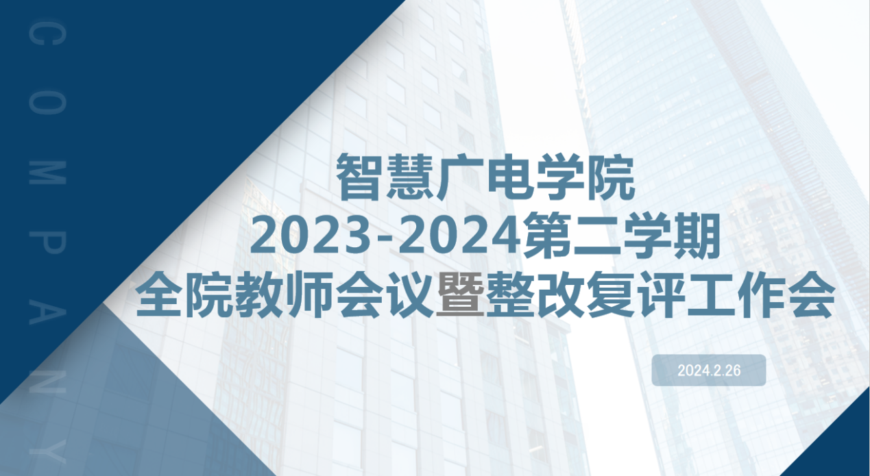 2月26日上午10:00,智慧广电学院在2A09-107教室召开2023-2024学年第二学期全院教师大会暨整改复评工作会,学院全体教职工参加会议,会议由学院副院长冉峡同志主持。