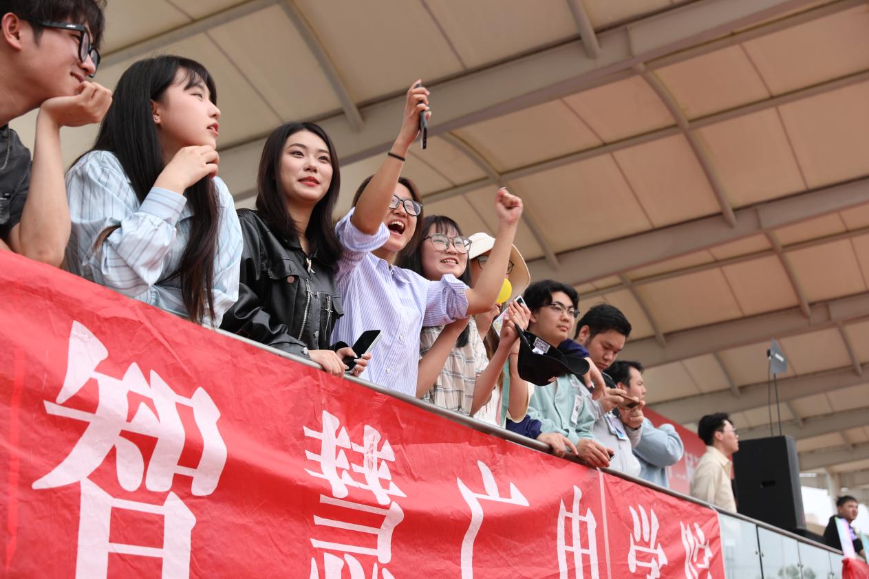 看台上,跑道边,观赛的同学竭力呐喊,挥舞着彩旗和标语为学院的运动员们加油助威。要在场下也争个高低。展现了智慧广电学院上下一心的团结拼搏精神。运动场上欢呼声、助威声、加油声交织在一起,充满了激情和活力。