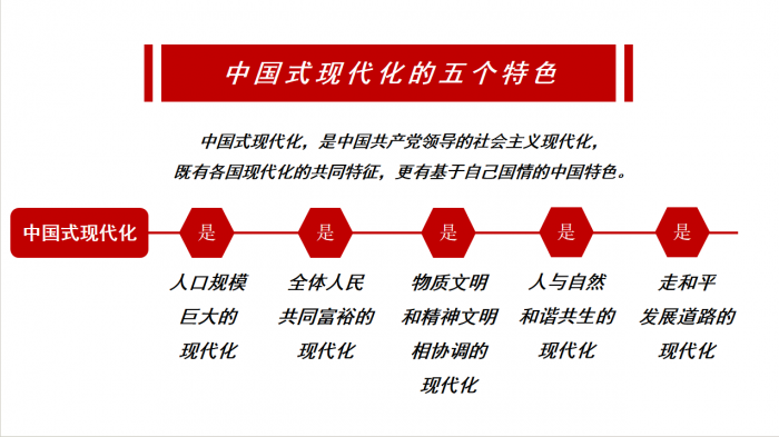 以及中国式现代化的五个特色,是中国共产党领导的社会主义现代化;既有各国现代化的共同特征,更有基于自己国情的中国特色。中国式现代化是人口规模巨大的现代化;是全体人民共同富裕的现代化;是物质文明和精神文明相协调的现代化;是人与自然和谐共生的现代化;是走和平发展道路的现代化。