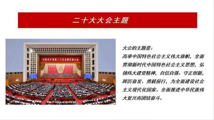 课堂上,祝杨文书记首先让同学明确一点,即二十大的会议主题为:高举中国特色社会主义伟大旗帜,全面贯彻新时代中国特色社会主义思想,弘扬伟大建党精神,自信自强、守正创新,踔厉奋发、勇毅前行,为全面建设社会主义现代化国家、全面推进中华民族伟大复兴而团结奋斗。