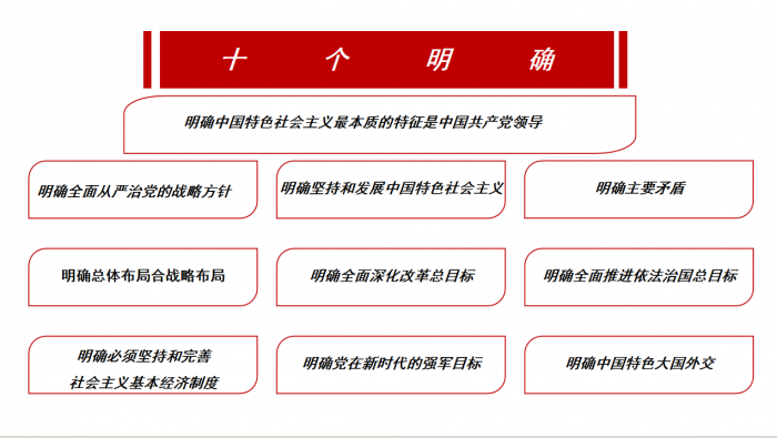 同时还有十个明确,即明确中国特色社会主义最本质的特征是中国共产党领导;明确全面从严治党的战略方针;明确坚持和发展中国特色社会主义;明确主要矛盾;明确总体布局合战略布局;明确全面深化改革总目标;明确全面推进依法治国总目标;明确必须坚持和完善社会主义基本经济制度;明确党在新时代的强军目标;明确中国特色大国外交。