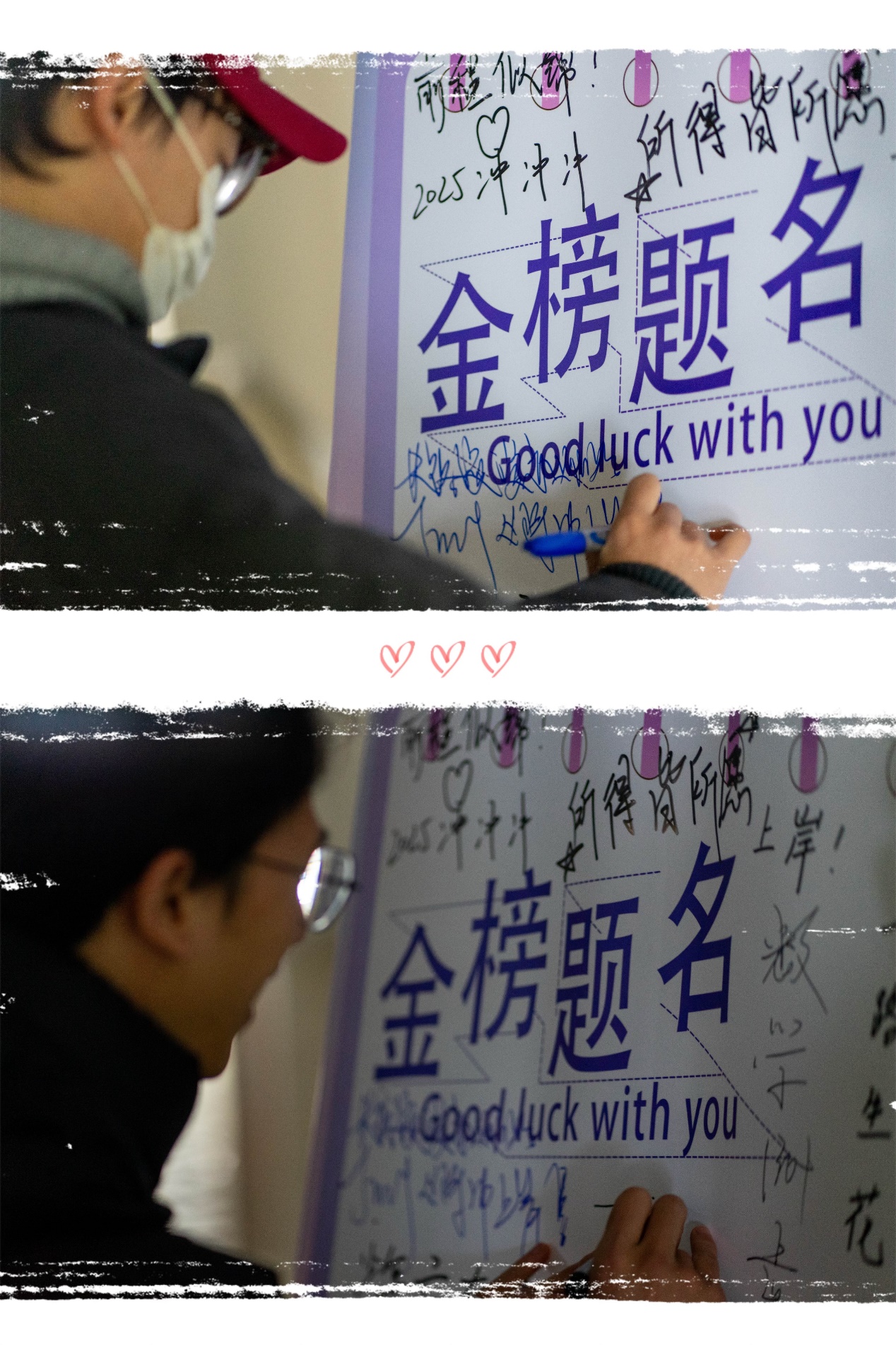 活动现场设置了留言板,让学子们写下自己的考研目标、心声及祝福。许多学子在留言板上认真书写,表达自己对上岸的期待。留言内容中既有对未来的憧憬,也有对自我能力的鼓励。其中一位学子在留言板上写道:“下一站,上岸!”另一位学子则写到:“感谢学院的关心,让我倍感温暖!”学院师弟师妹们也积极参与,在留言板上留下了对师哥师姐的鼓励与支持,传递着温暖的情感。