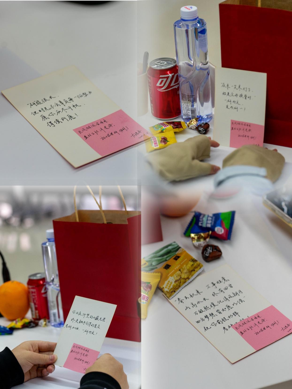 参与活动的老师和团学志愿者为考研学子精心准备了大礼包,旨在为备考学生加油鼓劲。每一份大礼包都寄托着老师们对学生们的关心与祝福,学生们纷纷表示,感受到了浓浓的温暖与鼓励。