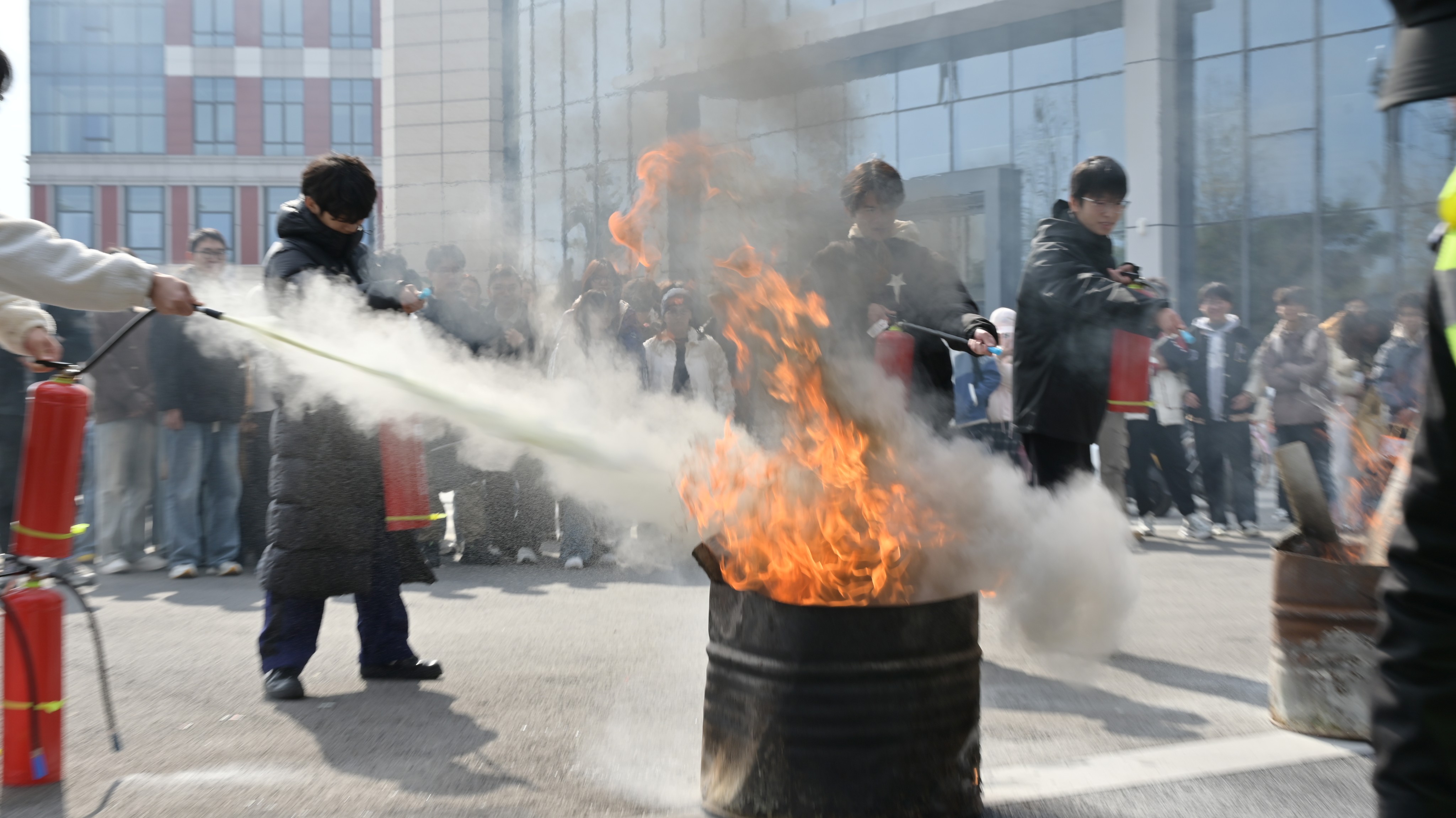理论宣讲结束后,全体师生移步至楼下空旷场地进行灭火器实操演练。在保卫处工作人员的规范示范后,同学们在陈波老师的专业指导下踊跃上前,亲身体验了如何正确使用干粉灭火器扑灭初期火源。通过“零距离”的实践,同学们成功将理论知识转化为实战技能,有效提升了应对火灾的自救互救能力。