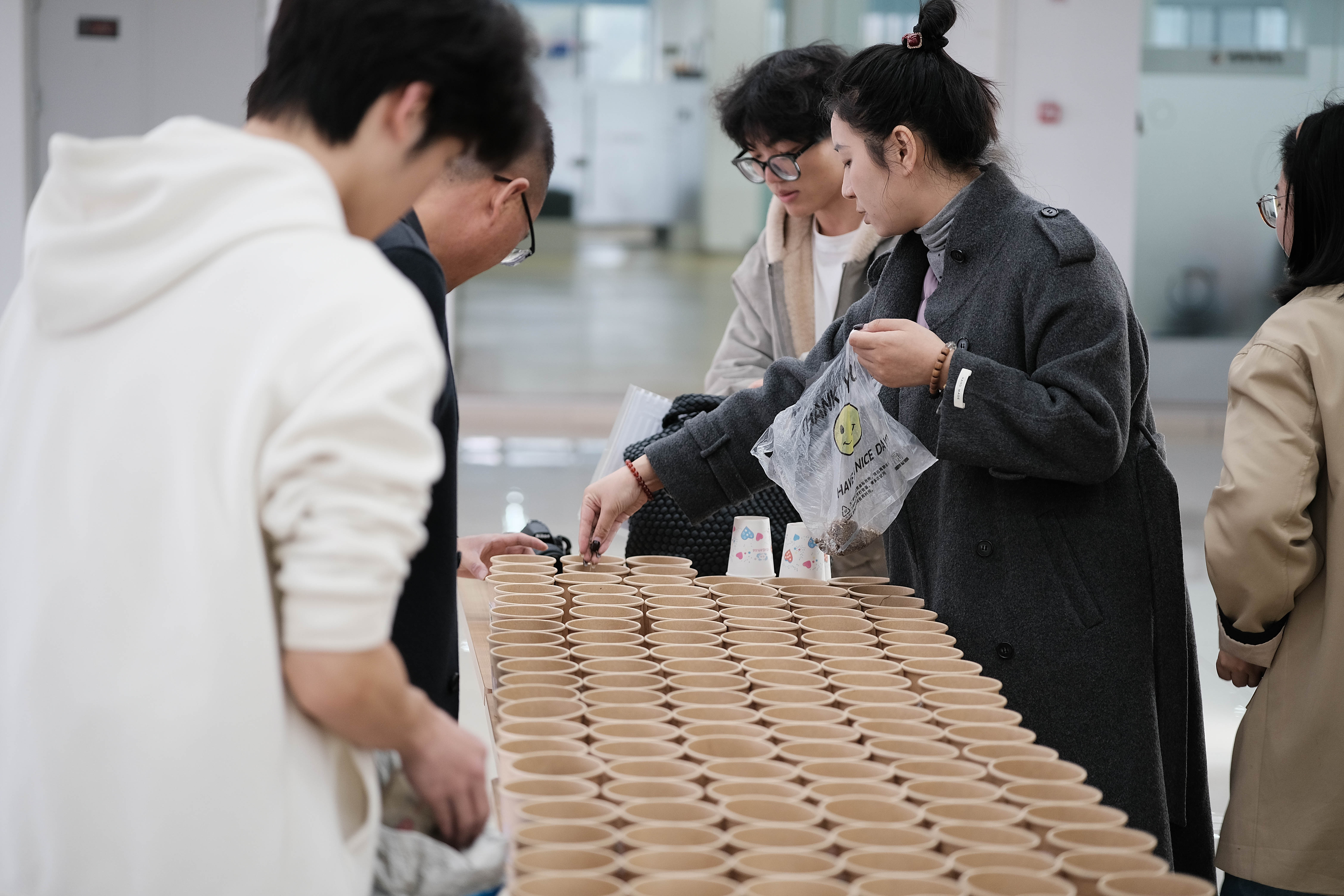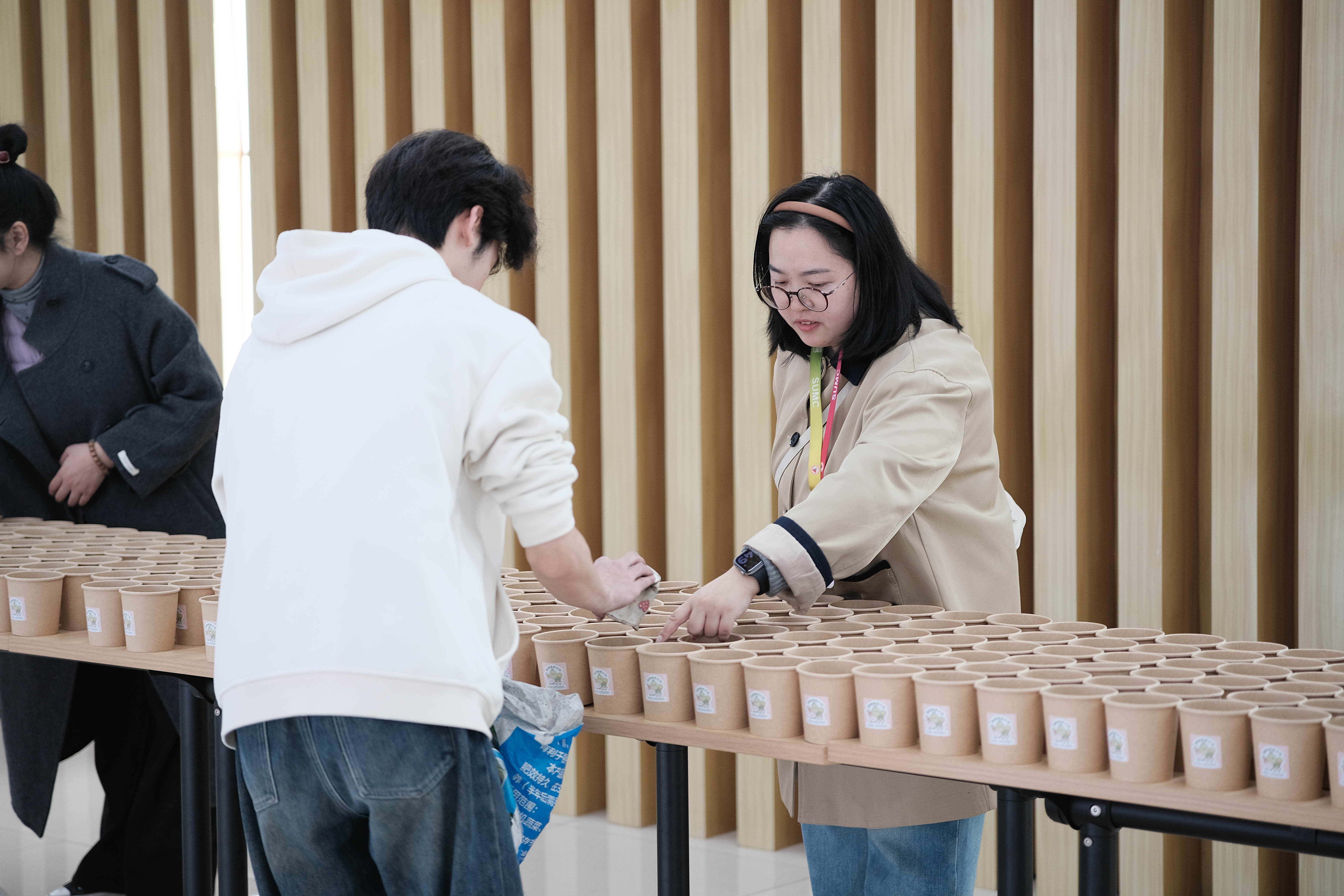 为确保活动有序、高效开展,活动开始前,工作人员提前抵达活动现场,分工明确、配合默契,有条不紊地开展筹备工作。大家认真摆放活动所需的绿植种子、种植杯、营养土等物料,细致完成种植杯的简易装杯、物料分类摆放等前期准备,反复检查现场布置细节。