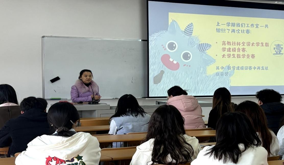 会议伊始,首先王国旭对工作室上学期的工作与成绩进行了全面总结。在上一学期,工作室紧密围绕学科竞赛与能力提升,成功组织并全程支持同学们参与了“高教社杯全国大学生数学建模竞赛”与“全国大学生数学竞赛”两项重要赛事。在数学建模国赛中,工作室成员克服困难,勇于挑战,最终有张万茹、杨莹、杨雪和杨瑞、符永悦、王国旭这两支队伍凭借扎实的模型构建、清晰的论文写作和出色的团队协作,在激烈的竞争中脱颖而出,为工作室和学校赢得了荣誉。在数学竞赛中,同学们也积极备赛,展现了良好的数学素养。